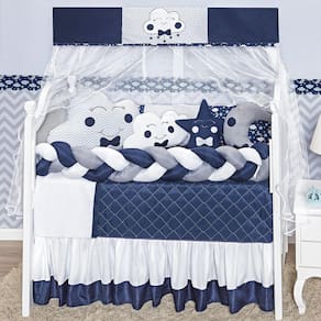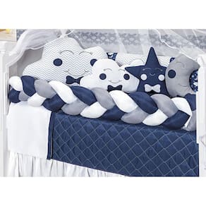Jogo enxoval de berço menino completo e cheio marinho 12p Kit berço nuvem 12 peças Atenção este é o melhor e mais completo kit berço do mercado Total 12 peças 1 cabeceira------------------0.60x0.40 mts 1 tranças -----------------------1.25x0.0,12mts 1 laterais -----------------------1.25x0.25mts 1 lençol de cima ------------1.30x0.70 mts 1 fronha ---------------------0.28x0.38 mts 1 bando do mosqueteiro---1.40x0.20 mts 1 mosqueteiro---------------4.50x1.50 mts 1 almofada nuvem --------0.40x0.20 mts 1 almofada lua ----------0,30 x 0,22 mts 1 almofada estrela---- 0,30 x 0,30 mts 1 saia box -------------1,30 x 0,70 x 0,30 mts 1 edredom--------------------130cm x 75cm Descrição das peças:Tecido estampado: 100% algodão Tecido liso: 50% algodão 50% poliésterEnchimento 100% poliésterMosqueteiro 100% poliamida Informações importantes:O produto já vai pronto para o uso, com o enchimento já incluso.Acompanha as peças conforme a descrição, não esta incluso o berçoA cabeceira e as laterais do kit possuem zíper para retirar o enchimento, facilitando assim uma possível lavagem do produto.
