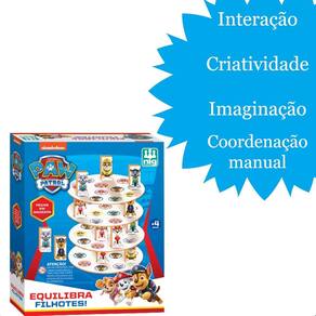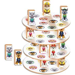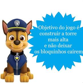 Atividade educativa para a criança montar a torre mais alta, equilibrando os filhotes da Patrulha Canina nas placas com os personagens.