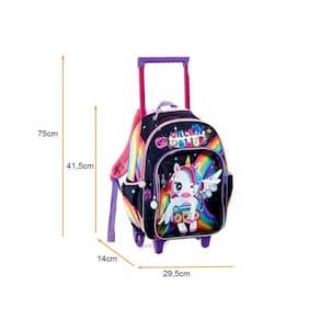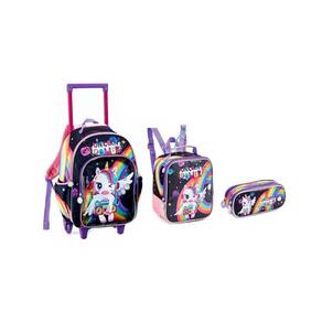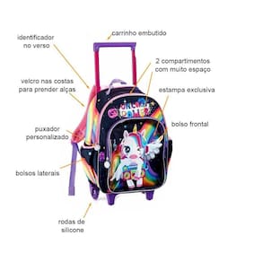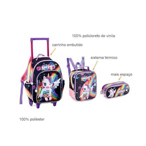 Jogo Escolar 3 Peças Unicórnio Roda Lancheira Estojo Dl1440 Este Kit Escolar acompanha Mochila de Rodinhas, Lancheira e estojo todos duráveis e versáteis que aguentam o dia a dia escolar. Os acessórios são práticos e úteis que acompanham todas as atividades, além de facilitar a vida escolar, agrega mais praticidade e conforto ao cotidiano da sua filha. Medidas da Mochila: 41cm x 29,5cm x 14cm e com haste 64cm de Altura Medidas da Lancheira: 20cm x 20cm x 8cm Medidas do Estojo: 22cm x 10cm x 7cm Composição: 100% Poliéster O Produto Possui: Mochila de Carrinho Suporte para garrafa nas laterais na Mochila. Rodas em silicone Carrinho embutido Alças no verso Lancheira Sistema térmico Alça na parte superior da Lancheira Elástico nas costas para fixação no carrinho Estojo Muito espaço. Ean: 7893236693787