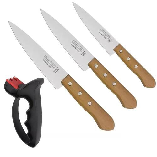 Conjunto Kit Jogo Faca Tramontina Carbono Cabo De Madeira N5 6 7 Cozinha Com Amolador