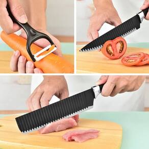 Lâminas com revestimento texturizado reduzem o atrito com os alimentos impedindo a aderência durante o corte.