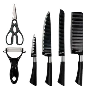 Jogo de Facas 6 Peças Aço Inox Cozinha - Tesoura Knife Set PretoTransforme a sua experiência na cozinha com o Jogo de Facas 6 Peças Aço Inox Cozinha - Tesoura Knife Set Preto! Este conjunto premium oferece não apenas beleza estética, mas também desempenho excepcional para tornar suas atividades culinárias mais eficientes e seguras.Descrição:Desenvolvido com seis peças de revestimento antiaderente, cada lâmina afiada possui um design de ângulo que, combinado com cabos ergonômicos, proporciona precisão e segurança incomparáveis. As peças são feitas de aço inox durável e de alta qualidade, selecionadas para usos específicos, tornando este conjunto ideal para todas as suas necessidades diárias na cozinha.Especificações:Dimensões aproximadas: (C) 21cm x (L) 36cm x (A) 3cm (Produto com Embalagem)Peso aproximado: 620gComposição: Aço Inox e PlásticoCor: PretoItens inclusos:1 Cutelo - 30 cm (Com o Cabo)1 Faca para Fatiar – 33 cm (Com o Cabo)1 Faca para Chef – 32,5 cm (Com o Cabo)1 Faca de Aparar – 20 cm (Com o Cabo)1 Tesoura de Cozinha – 13 cm (Com o Cabo)1 Descascador de Legumes – 14 cm (Com o Cabo)Recomendações e Cuidados:Mantenha suas facas sempre afiadas e secas, evitando o uso de produtos abrasivos. São resistentes ao uso em máquina de lavar, mas é aconselhável a lavagem manual com detergente neutro. Mantenha fora do alcance das crianças devido à natureza cortante e perfurante do produto.Garantia e Devolução:Sua satisfação é nossa prioridade! Oferecemos uma garantia especial de 3 meses. Além disso, entendemos que você precisa de tempo para se apaixonar pelo nosso Jogo de Facas, por isso, concedemos 7 dias para testar o produto sem custo adicional. Se não estiver 100% satisfeito, aceitamos o produto de volta. Estamos comprometidos em proporcionar a melhor experiência culinária, sem riscos para você. Invista na qualidade, invista no Tesoura Knife Set Preto! Marca: innovaree-commerce