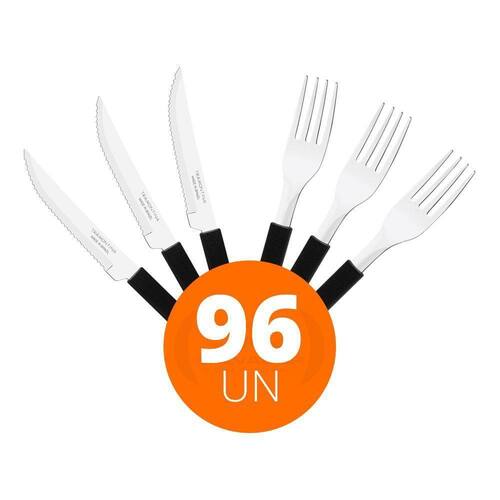 OBS: Veja na descrição os itens que acompanham o jogo.COMPONENTES DO KIT:48 Faca para Churrasco Leme com Lâmina em Aço Inox e Cabo de Polipropileno Preto 4- Tramontina 2318040448 Garfo de Mesa Leme com Lâmina em Aço Inox e Cabo de Polipropileno Preto - Tramontina 23182400Faca para Churrasco Leme com Lâmina em Aço Inox e Cabo de Polipropileno Preto 4- Tramontina 23180404Garantia: 90 dias para vícios ou defeitos de fabricação- Ideal para Restaurante, Lancheria, Padaria, Linha Doméstica, Residência, Gourmet;- A lâmina de aço inox tem maior durabilidade do fio devido ao tratamento térmico.- O cabo de polipropileno possui maior resistência e durabilidade.- Pode ir à máquina de lavar louças facilitando seu dia a dia.- Peso Líquido: 0,016 kg.- Peso Bruto: 0,016 kg.- Dimensões Embalagem : 9cm A X 18cm L X 20cm PGarfo de Mesa Leme com Lâmina em Aço Inox e Cabo de Polipropileno Preto - Tramontina 23182400Garantia: 90 dias para vícios ou defeitos de fabricação- Ideal para Restaurante, Lancheria, Padaria, Linha Doméstica, Residência, Gourmet;- A lâmina de aço inox garante maior resistência devido a espessura do aço e a estampagem da lâmina.- O cabo de polipropileno possui maior resistência e durabilidade.- Pode ir à máquina de lavar louças facilitando seu dia a dia.- Peso Líquido: 0,021 kg.- Peso Bruto: 0,025 kg.- Dimensões Produto: 13cm A x 23cm L x 18,5cm P.