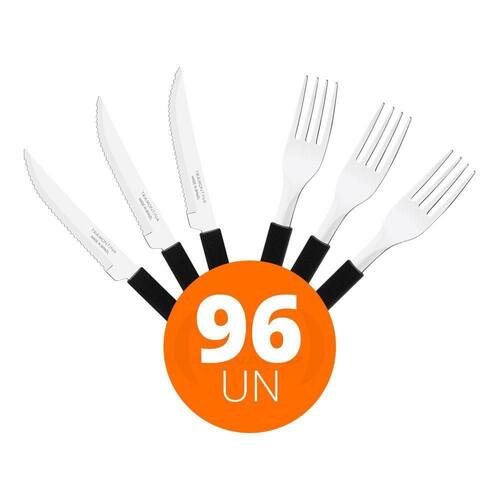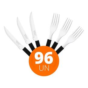 COMPONENTES DO KIT: 48 Faca para Churrasco Leme com Lâmina em Aço Inox e Cabo de Polipropileno Preto 4- Tramontina 23180404 48 Garfo de Mesa Leme com Lâmina em Aço Inox e Cabo de Polipropileno Preto - Tramontina 23182400