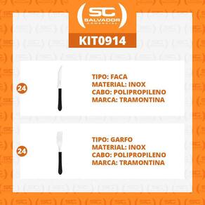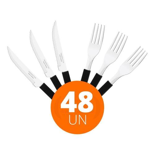 OBS: Veja na descrição os itens que acompanham o jogo.COMPONENTES DO KIT:- 24 Faca para Churrasco Leme com Lâmina em Aço Inox e Cabo de Polipropileno Preto 4- Tramontina 23180404- 24 Garfo de Mesa Leme com Lâmina em Aço Inox e Cabo de Polipropileno Preto - Tramontina 23182400Faca para Churrasco Leme com Lâmina em Aço Inox e Cabo de Polipropileno Preto 4- Tramontina 23180404Garantia: 90 dias para vícios ou defeitos de fabricação- A lâmina de aço inox tem maior durabilidade do fio devido ao tratamento térmico.- O cabo de polipropileno possui maior resistência e durabilidade.- Pode ir à máquina de lavar louças facilitando seu dia a dia.- Peso Líquido: 0,016 kg.- Peso Bruto: 0,016 kg.- Dimensões Embalagem : 9cm A X 18cm L X 20cm PGarfo de Mesa Leme com Lâmina em Aço Inox e Cabo de Polipropileno Preto - Tramontina 23182400Garantia: 90 dias para vícios ou defeitos de fabricação- Ideal para Restaurante, Lancheria, Paderia, Linha Doméstica, Residência, Gourmet;- A lâmina de aço inox garante maior resistência devido a espessura do aço e a estampagem da lâmina.- O cabo de polipropileno possui maior resistência e durabilidade.- Pode ir à máquina de lavar louças facilitando seu dia a dia.- Peso Líquido: 0,021 kg.- Peso Bruto: 0,025 kg.- Dimensões Produto: 13cm A x 23cm L x 18,5cm P.