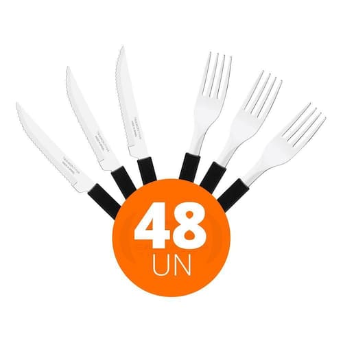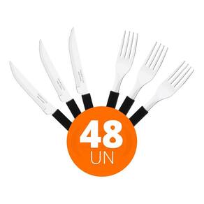 COMPONENTES DO KIT: - 24 Faca para Churrasco Leme com Lâmina em Aço Inox e Cabo de Polipropileno Preto 4- Tramontina 23180404 - 24 Garfo de Mesa Leme com Lâmina em Aço Inox e Cabo de Polipropileno Preto - Tramontina 23182400