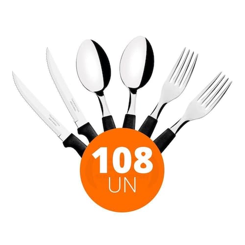 Componentes do KIT: - 36 Faca para Churrasco Ipanema com Lâmina em Aço Inox e Cabo de Polipropileno Preto 5 - Tramontina 23360405 - 36 Garfo de Mesa Ipanema com Lâmina em Aço Inox e Cabo de Polipropileno Preto - Tramontina 23362400 - 36 Colher de Mesa Tramontina Ipanema com Lâmina em Aço Inox e Cabo de Polipropileno Preto 23363400