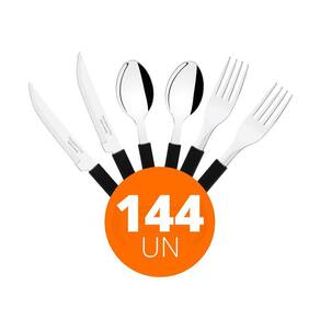 OBS: Veja na descrição os itens que acompanham o jogo. COMPONENTES DO KIT: 48 Faca para Churrasco Leme com Lâmina em Aço Inox e Cabo de Polipropileno Preto 4- Tramontina 23180404 48 Garfo de Mesa Leme com Lâmina em Aço Inox e Cabo de Polipropileno Preto - Tramontina 23182400 48 Colher de Sopa Leme com Lâmina em Aço Inox e Cabo de Polipropileno Preto - Tramontina 23183400 : 90 dias para vícios ou defeitos de fabricação; - Ideal para Restaurante, Lancheria, Padaria, Linha Doméstica, Residência, Gourmet; Faca para Churrasco Leme com Lâmina em Aço Inox e Cabo de Polipropileno Preto 4- Tramontina 23180404 - Pode ir à máquina de lavar louças facilitando seu dia a dia. - Peso Líquido: 0,016 kg. - Peso Bruto: 0,016 kg. - Dimensões Embalagem : 9cm A X 18cm L X 20cm P Garfo de Mesa Leme com Lâmina em Aço Inox e Cabo de Polipropileno Preto - Tramontina 23182400 - A lâmina de aço inox garante maior resistência devido a espessura do aço e a estampagem da lâmina. - Pode ir à máquina de lavar louças facilitando seu dia a dia. - Peso Líquido: 0,021 kg. - Peso Bruto: 0,025 kg. - Dimensões Produto: 13cm A x 23cm L x 18,5cm P. Colher de Sopa Leme com Lâmina em Aço Inox e Cabo de Polipropileno Preto - Tramontina 23183400 - A lâmina de aço inox garante maior resistência devido a espessura do aço e a estampagem da Lâmina. - Pode ir à máquina de lavar louças facilitando seu dia a dia. - Peso Líquido: 0,027 kg. - Peso Bruto: 0,029 kg. - Medidas Externas: 18,3cm x 3,9cm concha