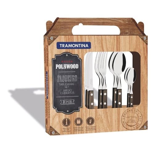 Conjunto Talheres Inox 24 Peças Polywood Tramontina 21199/905 Conteúdo: 6 - 21100/075 - Facas para churrasco 5 6 - 21102/070 - Garfos de mesa 6 - 21103/070 - Colheres para mesa 6 - 21107/070 - Colheres para chá Descrição: As refeições informais não dispensam a qualidade dos talheres, utensílios e facas. Por isso, a Linha Polywood têm lâminas de aço inox em formato e espessura que garantem a resistência e evitam deformações. O tratamento térmico dá mais durabilidade ao fio e o cabo de madeira tratada polywood, fixado com rebites de alumínio, é confortável à pega. Com cinco anos de , permanecem bonitos mesmo com uso intenso e submetidos a impactos e altas temperaturas. Podem ir à máquina de lavar louças. Lâminas de aço inox. Cabos de madeira tratada Polywood. Rebites de aluminio. Uso seguro: Antes da primeira utilização, lave bem as peças e seque-as. Tenha cuidado ao manusear produtos cortantes e perfurantes e mantenha-os fora do alcance de crianças. Para maior durabilidade dos produtos, recomenda-se secar bem antes de guardar, mesmo após lavagem em máquina. Para descarte dos produtos e embalagens siga as orientações de reciclagem vigentes. Complemento: EAN13: 7891112108660 DUN14: 17891112108667 NCM: 8215.20.00 Peso Líquido: 1,1100 kg. Peso Bruto: 1,2750 kg. Metragem: 0,003786 m Dimensões Embalagem Compr. X Larg. X Alt. : 246x 54x 285 mm. Dimensões Produto Compr. X Larg. X Alt. : 406x 43 Marca: Não Informado Ean: 7891112108660