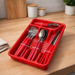 Jogo Faqueiro Inox 25 Peças Vermelho com Porta Talheres Organizador de Gaveta Estrutura das lâminas em aço inoxidável para maior durabilidade. Cabos em polipropileno com design ergonômico na cor vermelha. Organizador de gaveta tipo gaveteiro incluso para separação dos utensílios. Conjunto completo com 24 talheres para servir até 6 pessoas simultaneamente. Facas com fio de corte eficiente para diferentes tipos de alimentos.