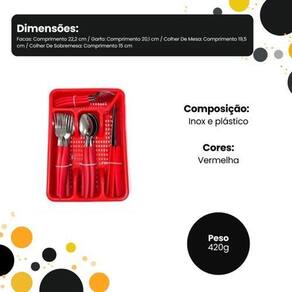 ESPECIFICAÇÕES TÉCNICAS Material das lâminas: Aço inoxidável Material dos cabos: Plástico (Polipropileno) Quantidade de peças: 25 unidades Vermelha Comprimento Facas: 22,2 cm Comprimento Garfos: 20,1 cm Comprimento Colheres de Mesa: 19,5 cm Comprimento Colheres de Sobremesa: 15,0 cm Peso total aproximado: 420g Porta talheres incluso: Sim