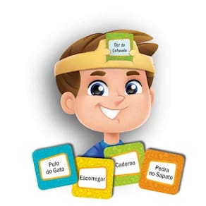 Embaralhe as cartas e faça um monte com a face virada para baixo. Todos os participantes colocam a cinta na cabeça e um jogador é escolhido para iniciar o jogo. O jogador escolhido pega uma carta do monte e sem vê-la, peça para que um dos jogadores ajude colocando a carta na sua testa encaixando-a na cinta. O primeiro jogador da esquerda vira a ampulheta e começa a fazer as mímicas para que o jogador com a carta na testa adivinhe o conteúdo, se ao passar o tempo da ampulheta e o jogador não souber, passa a vez para o próximo jogador fazer a mímica, e assim, sucessivamente. Se após, todos os participantes, fizerem a mímica e o jogador não decifrar, ninguém pontua, a carta é retirada do jogo e a vez vai para o próximo participante. Se a mímica for decifrada, o jogador que acertou ganha um ponto, fique com a carta para a contagem dos pontos. Ganha quem acertar mais mímicas no final do jogo. Seja criativo para que descubram o conteúdo da carta, mas não pode falar ou escrever as palavras.