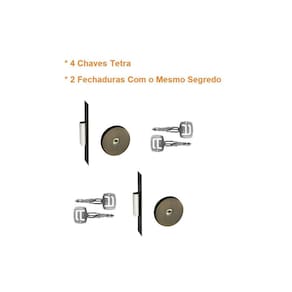 Jogo fechadura auxiliar trava segurança tetra pado 11000 antique ouro velho redonda 40mm mesma chave segredo dupla par Jogo com 2 travas pado com chave tetra - dupla com mesmo segredo - marca: pado - acabamento: roseta redonda antique bx - referência do fabricante: trava ix 11000 bx - composição: aço e inox - conteúdo da embalagem: 02 travas, 04 chaves tetra e parafusos - guarnição: 4 rosetas em inox, fixadas por pressão em almas plásticas a serem fixadas na porta por parafusos auto-atarrachantes de cabeça fenda philips em latão - aplicação: portas de espessura 30 a 40mm - : 1 ano contra defeitos de fabricação e/ou funcionamento Vide condições na embalagem do produto . Marca: Não Informado
