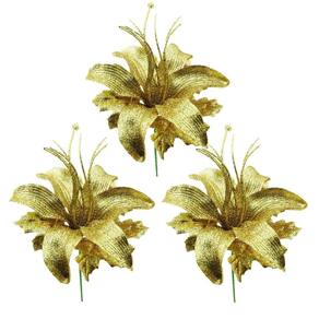 03 unidades Flor Lírio Natalino Glitter Dourado 24cm - Yangzi