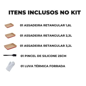 01 Assadeira N1 01 Assadeira N2 01 Assadeira N3 01 Pincel Culinário de Silicone 01 Luva Térmica de Cozinha