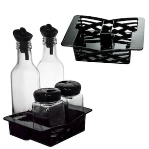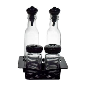 O Conjunto de Azeiteiro e Porta Condimento de Vidro com Bico Dosador da Casambiente foi criado para tornar esse momento ainda mais prático e elegante. Composto por duas garrafas de vidro de 250ml e dois potes de condimentos de 160ml, o conjunto é perfeito para armazenar e servir seus temperos favoritos com precisão e muito mais controle. O vidro transparente oferece uma visualização clara do conteúdo e ajuda na identificação rápida dos ingredientes, enquanto as tampas pretas com acabamento fosco garantem um toque de modernidade ao conjunto. O destaque fica por conta dos bicos dosadores dos galheteiros, que facilitam o uso de líquidos como azeite e vinagre, oferecendo um fluxo contínuo e preciso, sem desperdício. É o conjunto ideal para quem deseja organizar a cozinha com bom gosto, mantendo os ingredientes à vista e ao alcance, sem abrir mão da estética e da funcionalidade. Perfeito para o dia a dia e também para compor a mesa em ocasiões especiais. Dimensões: 2 Galheteiros: 20cm de altura x 4,5cm de diâmetro x 2,5cm de diâmetro da boca Capacidade: 250ml 2 Porta Condimentos: 9,5cm altura x 4cm de diâmetro x 4cm de diâmetro da boca