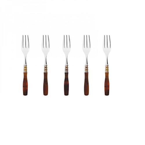 O jogo de 6 garfos para sobremesa da Linha Arianna da Bugatti é composto por um anel cromado trançado inspirado no famoso fio de Ariadne que lhe dá o nome, e um elegante cabo de madrepérola em acrílico colorido.