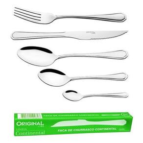 Ficha técnica kit faqueiro: 12 Garfos de mesa 2,5x20,7 Espessura do cabo 2,5mm, peso por peça 0,04Kg. 12 Facas de Churrasco 2x22,1 Espessura do cabo 2mm , peso por peça 0,04Kg. 12 Colheres de Mesa 4,4x20cm Espessura do cabo 2mm, peso por peça 0,041Kg. 12 Colheres de Sobremesa 3,8x16,5cm Espessura do cabo 1,4mm, peso por peça 0,031Kg. 12 Colheres de Chá 2,5x12,7cm Espessura do cabo 1,2mm, peso por peça 0,013Kg.