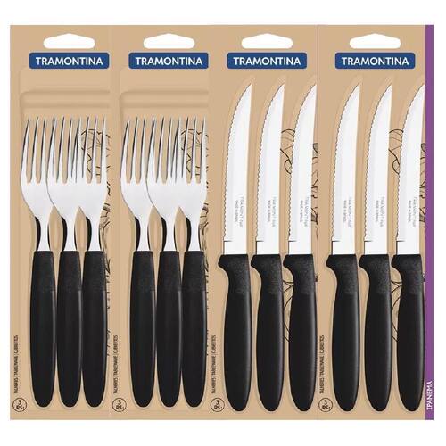 Descrição do Produto: As lâminas de aço inox garantem maior resistência devido a espessura do aço e a estampagem das lâminas. Os cabos de polipropileno possuem maior resistência e durabilidade. Podem ir à máquina de lavar louças facilitando seu dia a dia. Nesta Embalagem Contém 06 Garfos de Mesa Preto. Nesta Embalagem Contém 06 Facas Para Churrasco Preto.