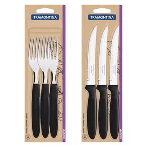 Descrição do Produto: As lâminas de aço inox garantem maior resistência devido a espessura do aço e a estampagem das lâminas. Os cabos de polipropileno possuem maior resistência e durabilidade. Podem ir à máquina de lavar louças facilitando seu dia a dia. Nesta Embalagem Contém 03 Garfos de Mesa Preto. Nesta Embalagem Contém 03 Facas Para Churrasco Preto.