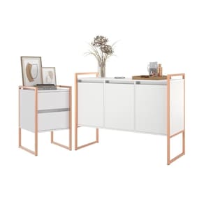 Com estrutura em aço 20x20, as peças apresentam durabilidade e estilo único. O buffet tem 3 portas e o gaveteiro possui duas gavetas espaçosas para organização. O acabamento em pintura epóxi proporciona um toque refinado e resistente.