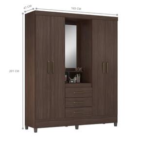 O guarda roupa é feito em MDP. Possui 3 gavetas com corrediça telescópicas, 4 portas, 2 cabideiros, 5 prateleiras e 5 nichos.