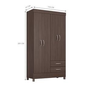 O guarda roupa é feito em MDP. Possui 2 gavetas com corrediça telescópicas, 4 portas, 2 cabideiros, 3 prateleiras e 5 nichos.