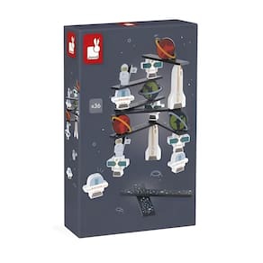 Ficha Técnica Conteúdo da Embalagem: 36 peças coloridas (5 astronautas, 5 satélites, 4 foguetes, 5 planetas, 5 OVNIs, 12 pranchas antigravidade) Dimensões aproximadas: peças variadas Material: madeira Idade recomendada: a partir de 2 anos