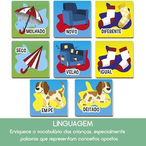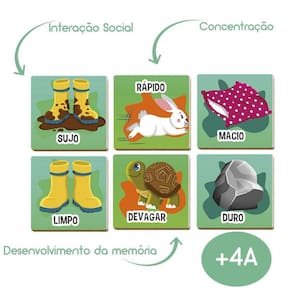 Memória dos Opostos é um jogo educativo que auxilia a criança no aprendizado dos opostos, associando-os com divertidas figuras até que não sobre mais peças. São 24 peças em madeira, coloridas e divertidas que auxiliam em diversos aspectos no desenvolvimento da criança, entre eles: interação, coordenação motora, memorização, raciocínio lógico, atenção e foco.
