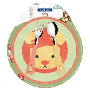 O jogo infantil tramontina Baby Friends colorido 03 peças é perfeito para estimular a autonomia e a rotina alimentar das crianças. Suas peças são produzidas em poliproleno e contam com proteção antimicrobiana que inibe o crescimento de fungos e bactérias por toda sua vida útil. Os talheres são muito resistentes, fáceis de limpar e vão deixar a refeição dos pequenos ainda mais especial! Orientações Lâminas de aço inox com bordas arredondadas que não machucam a boca da criança.Os cabos de polipropileno possuem maior resistência e durabilidade.Prato de polipropileno com borda mais alta para auxiliar a alimentação, evitando que a comida saia do prato. Produtos com proteção antimicrobiana que inibem o crescimento de fungos e bactérias, proporcionando benefícios em higiene e redução de microorganismos que causam contaminação.Podem ir a máquina de lavar louças, facitando a limpeza. Produtos Livre de BPA: O Bisfenol-A é um componente químico usado na produção de alguns plásticos como o Policarbonato. Este componente pode ser prejudicial à saúde e por isso a Tramontina não o utiliza em seus produtos. Características Gerais EAN13 7891112299597 DUN14 17891112299594 NCM 3924.10.00 Peso Líquido 0,1400 kg. Peso Bruto 0,1700 kg. Metragem 0,000881 m³. Dimensões Embalagem (Compr. X Larg. X Alt.) 233x 14x 270 mm. Observações Recomenda-se o uso destes produtos para crianças com 12 meses ou mais. Tenha cuidado ao manusear o garfo por ser produto perfurante. Antes da primeira utilização, lave bem as peças e seque-as. Estes produtos podem ir à máquina de lavar, porém não recomendamos usar produtos abrasivos como saponáceos, esponjas rígidas ou palhas de aço. Seque-os bem antes de guardar. O prato pode ser usado no micro-ondas para aquecimentos breves de, no máximo, 3 minutos. Para descarte dos produtos e embalagem siga as orientações de reciclagem vigentes. Atenção: Por razões de segurança e saúde do seu filho, utilizar sempre os produtos com supervisão de um adulto. Não utilize os produtos caso apresentarem dano ou defeito. Verifique sempre a temperatura do alimento antes da alimentação.