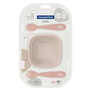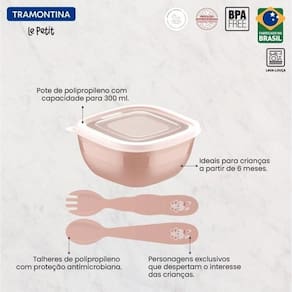 Jogo Infantil Tramontina Le Petit 3 Peças Rosa As refeições do seu bebê ficarão muito mais encatadoras com o jogo infantil Tramontina Le Petit rosa 03 peças. Composto por pote e talheres em polipropileno com proteção antimicrobiana que inibem o crescimento de fungos e bactérias, o jogo é ideal para armazenar as refeições do seu bebê, seja para alimentá-los em casa ou em um lanche durante um passeio, pois seu pote pode ser levado ao micro-ondas, freezer ou geladeira. O jogo ainda pode ser levado à máquina de lavar louças e pode ser levado a máquina de lavar louças, facitando a limpeza. Escolha Tramontina e garanta uma rotina muito mais tranquila e agradável com seu bebê! Recomendações de Uso: Recomenda-se o uso destes produtos para crianças com 6 meses ou da primeira utilização, lave bem as peças e produtos podem ir à máquina de lavar, porém não recomendamos usar produtos abrasivos como saponáceos, esponjas rígidas ou palhas de aço. Seque-os bem antes de descarte dos produtos e embalagem siga as orientações de reciclagem ção: Por razões de e saúde do seu filho, utilizar sempre os produtos com supervisão de um adulto. Não utilize os produtos caso apresentarem dano ou . Verifique sempre a temperatura do alimento antes da alimentação. Informações Adicionais: