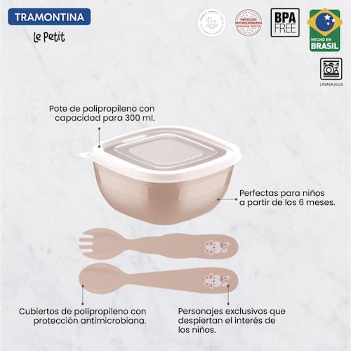 Pote, tampa e talheres de polipropileno com proteção antimicrobiana incorporada no processo de injeção que dura por toda vida útil dos produtos, inibindo o crescimento de bactérias e fungos.O pote pode ser levado ao micro-ondas (sem a tampa), refrigerador e freezer.Podem ir a máquina de lavar louças, facitando a limpeza.Produtos Livre de BPA: O Bisfenol-A é um componente químico na produção de alguns plásticos como o Policarbonato. Este componente pode ser prejudicial à saúde e por isso a Tramontina não o utiliza em seus produtos. NA