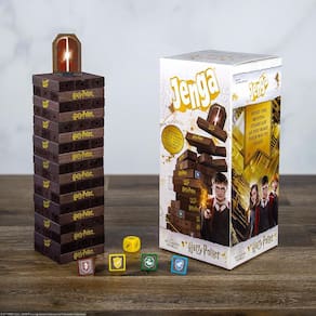 Suba em alturas, escalando a Grand Staircase nesta versão mágica do clássico jogo de empilhamento! JENGA: Harry Potter permite que os jogadores representem sua casa favorita de Hogwarts como o primeiro aluno a chegar à porta da sala de aula! Desafios imprevistos de remover e substituir blocos com base em cada rolo de um dado personalizado. - É hora da sua próxima aula na escola de Hogwarts de magia e bruxaria, mas primeiro você deve chegar à sua sala de aula no topo das escadas! Cuidado com os pisos que sempre mudam, pois eles podem cair se ficarem muito altos. - Com 54 blocos de madeira manchados de alta qualidade onde os marcadores da casa Hogwarts – Grifinória, Corvinal e Lufa – vá para o topo da escada na esperança de ser o primeiro a chegar à sala de aula - Construa a escada o mais alto possível, mas empilhe com cuidado ou você vai derrubar a torre e ter que reconstruir - Inclui 54 blocos Jenga de madeira, 1 dado personalizado, 4 marcadores de casa Hogwarts, 1 porta de sala de aula, 1 bandeja de carregamento e regras - Mais de 1 jogadores | Idades a partir de 6 anos | Tempo de jogo de 5 a 15 minutos