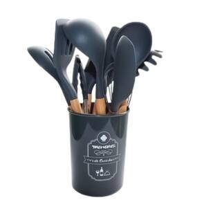 Esse lindo kit de talheres de silicone vai ficar maravilhoso na sua cozinha são 12 peças com os principais utensílios para você usar ao cozinhar para sua família ou amigos os talheres são em silicone com cabo de madeira. Cabo do pegador aço inox . Contém: - 1 suporte para utensílios; - 1 batedor de ovos; - 1 pincel; - 1 concha; - 1 espatula; - 1 espatula vazada; - 1 espatula redonda; - 1 espatula pão duro; - 1 colher; - 1 colher vazada; - 1 pegador de macarrão; - 1 pegador