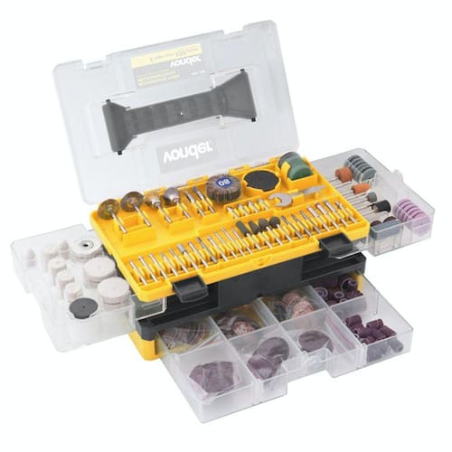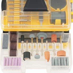 1 Jogo de acessórios para microrretífica, composto por: 1 disco diamantado, 30 lixas cilíndricas, 2 rodas de pano, 12 rodas de feltro, 2 pontas com feltro, 1 roda de borracha, 4 limas rotativas, 2 hastes para lixas cilíndricas, 11 limas rotativas diamantadas, 3 pontas montadas de óxido de alumínio, 6 rebolos de óxido de alumínio, 3 pontas montadas de carbureto de silício, 6 rebolos de carbureto de silício, 3 escovas de inox, 3 escovas de latão, 1 pasta para polimento, 108 discos de corte, 135 discos de lixa, 4 pinças para microrretífica, 1 haste para discos de corte, 1 haste para discos de borracha, 1 haste para discos de lixa, 1 haste para discos de feltro, 2 discos de corte de fibra de vidro, 1 chave para microrretífica, 1 roda de lixa (grão 80), 1 bastão abrasivo e 4 pontas montadas de borracha