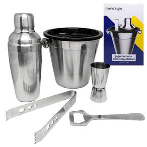 Características do produto Material: aço inox e plástico Dimensões: Balde 1,2litros: 13cm altura x 17cm largura x 14cm Coqueteleira: 18cm altura x 6,5cm largura x 7cm - 350ml Dosador: 5cm altura x 4cm largura - 25/50ml Pegador: 15cm comprimento x 2cm largura Abridor: 14cm comprimento x 4,5cm largura