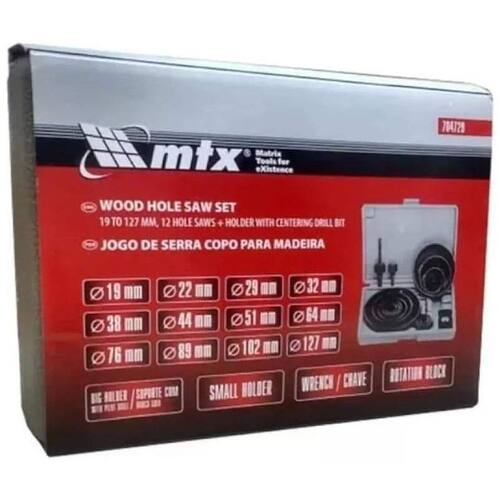 Jogo Kit Serra Copo 16 Peças 19 A 127mm Madeira Gesso Pvc Esse anuncio contém: -12 Serras Copo. -01 Suporte para Serra Copo com Broca guia. -01 Suporte sem Broca. -01 Adaptador Chave Allen. Principais duvidas: Serve para gesso Sim. Qual a marca Quick store. Serve para madeira Sim. Serve para MDF Sim. Qual é a profundidade do corte 25mm. O Jogo de Serra Copo é fabricado em material de ótimo qualidade. Oferecendo cortes muito rápidos e vida útil surpreendente, as Serras Copo MTX corta madeiras, placas de MDF ou compensado, com extrema facilidade. A serra copo realiza furos de 19 até 127 mm. - Grande mix de medidas. - agressiva, com menos esforço. - Gera pouco aquecimento. - O kit acompanha suportes que permitem utilizar as serras copo em sua furadeira, basta ter uma com o mandril de pelo menos 3/8 9mm ; - Não são indicadas para concreto, cimento, alvenaria etc. Marca: Não Informado