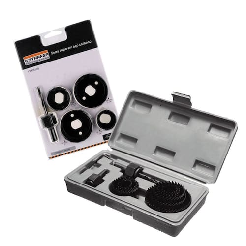 Jogo Serra Copo Em Aço Carbono Starfer com 5 Peças com dentes super afiados. Medidas: 1.1/4 à 2.1/8 32mm à 54mm + Suporte Indicado para cortes em madeira, aço e metais em geral. Ref.: 13005109 Jogo de serra copo para madeira em aço carbono com 1" 25mm de altura. Jogo com 8 peças, contem 5 lâminas nas medidas: 64mm, 76mm, 89mm, 102mm e 127mm de diâmetro. Acompanha chave hexagonal em aço carbono para fixação de broca piloto, adaptador de 3/8" 9,5mm com broca piloto em aço carbono e uma placa de fixação. Indicado para perfurar chapas de madeira, compensados e placas de gesso. Para uso em furadeiras. Ref.: 13005151 Marca: Starfer