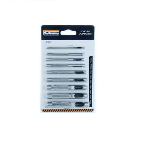 Diâmetro: 01 x Vazador / furador com diâmetro de 2,5mm; 01 x Vazador / furador com diâmetro de 3mm; 01 x Vazador / furador com diâmetro de 4mm; 01 x Vazador / furador com diâmetro de 5mm; 01 x Vazador / furador com diâmetro de 6mm; 01 x Vazador / furador com diâmetro de 7mm; 01 x Vazador / furador com diâmetro de 8mm; 01 x Vazador / furador com diâmetro de 9mm; 01 x Vazador / furador com diâmetro de 10mm; Marca Starfer Referência: 14900111 Ean: 7891638055950