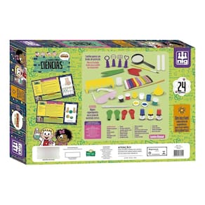 Contém: 02 tubos de ensaio, 01 lupa, 01 óculos de segurança, 01 pipeta, funil, corantes, guaches, massinha e muito mais!
