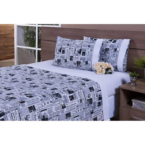 Jogo lençol 4 peças cama viúva 180 fios estampa de jornal barrado branco Jogo de lençol 4 peças cama 2,03 x 1,20 x 0,30 cama viúva 100% algodão 150 fios 01 lençol de cima 2,60m x 1,90m estampado de jornal 01 lençol de baixo com elástico ao redor de todo o lençol para melhor fixação no colchão não fica saindo da cama para colchão 2,03 x 1,20 x 0,30 cor lisa branco 02 fronhas 70cm x 50cm estampado de jornal Composição: tecido 100% algodão 180 fios Marca: Mtr Enxovais Ltda