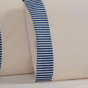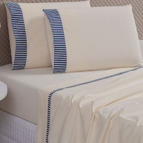 O Jogo de lençol Algodão com 04 peças com detalhe em listas na vira e na fronha com alto padrão de qualidade, proporciona conforto e sofisticação.