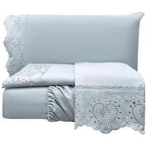 O Jogo de lençol para cama Casal Padrão com 04 peças confeccionado em tecido Percal 300 fios, detalhes em bordado inglês na fronha e no lençol de cima. Possui alto padrão de qualidade, proporciona conforto e sofisticação.
