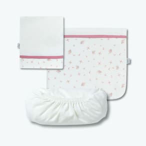 O Jogo de Lençol 3 peças Hug traz conforto e cuidado para o quartinho do bebê. O kit possui um lençol de elástico, uma fronha e um sobre lençol com vira em suedine estampado. Além disso, o sobre lençol é ótimo para cobrir o bebê. Indicado para berço padrão americano.