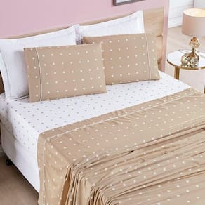 O Jogo de lençol para cama Queen padrão com 04 peças confeccionado em tecido Micropercal 200 Fios, estampa em Poá e detalhe em viés, com alto padrão de qualidade, proporciona conforto e sofisticação.