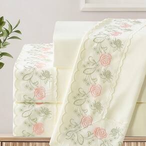 O Jogo de lençol para cama Queen com 04 peças confeccionado em tecido Percal 300 fios, detalhes bordado na fronha e no lençol de cima. Possui alto padrão de qualidade, proporciona conforto e sofisticação.
