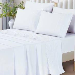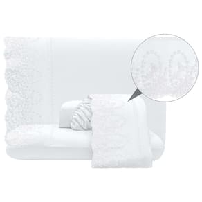 O Jogo de lençol para cama Queen com 04 peças confeccionado em tecido Percal 300 fios, detalhes em bordado inglês na fronha e no lençol de cima. Possui alto padrão de qualidade, proporciona conforto e sofisticação.