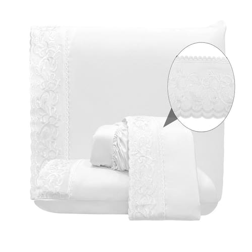 O Jogo de lençol para cama Queen com 04 peças confeccionado em tecido Percal 300 fios, detalhes em bordado inglês na fronha e no lençol de cima. Possui alto padrão de qualidade, proporciona conforto e sofisticação.