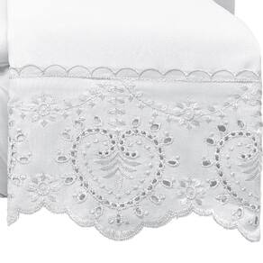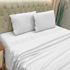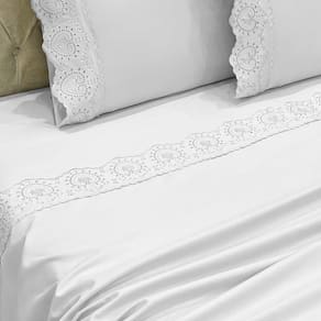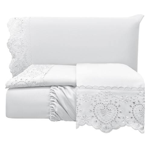 O Jogo de lençol para cama Queen com 04 peças confeccionado em tecido Percal 300 fios, detalhes em bordado inglês na fronha e no lençol de cima. Possui alto padrão de qualidade, proporciona conforto e sofisticação.