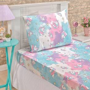 Especificações Produto: Jogo de lençol Tamanho: Solteiro Coleção: Diverkids Modelo: Unicórnio Cor: Rosa E Azul Composição do tecido: Malha com fio penteado 301 em 100% algodão Medidas do lençol: 1,88 m x 88 cm x 30 cm Medidas da fronha: 70 x 50 cm